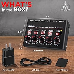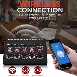 ULTRA-LOW NOISE DESIGN: Immerse yourself in pristine audio quality with our small four channel mixer, featuring a high headroom design and ultra-low noise. Perfect for musicians and content creators seeking professional-grade sound for their music FLEXIBLE STEREO/MONO SWITCHING: Tailor your audio setup effortlessly with eight mono/stereo switching inputs on this stereo mixer. Achieve the ideal balance for your devices and enhance your streaming and recording BLUETOOTH CONNECTIVITY: Stream music wirelessly with the latest Bluetooth 5.x technology on this mixer. Enjoy a seamless connection with a wireless range of up to 50 feet. Compatible with smartphones, tablets, and more BUILT-IN USB SOUND CARD: Elevate your computer audio experience with the convenience of the built-in USB sound card on this powered mixer. Play and record directly from your PC, ensuring seamless integration into your digital workflow SOLID METAL CHASSIS: It may be small, but it’s built with rugged durability. The solid metal chassis provides resilience in any situation. The compact size adds portability, making it an excellent choice for musicians, podcasters, and content creators on the go