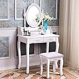 Vanity Table Set, 4 Drawers Makeup Table with Oval Mirror & Stool, Bedroom Wood Dressing Table White