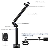 [ Articulating Arm ] : One pair of articulating tubes and magic arm ball joints are aluminum alloy material,each tube length is 6.29 inch /16cm and diameter is 0.94 inch / 2.4 cm,sturdy,durable,wear-resistant,rust and corrosion prevention,fashionable and elegant appearance,not easy to be damaged. [Multi-Angle Adjustable ]: Heavy-duty aluminum alloy tubes are connected by middle of one magic arm ball joints,one tube can 360°rotation freedoom by twisting joint knob,Mippko provides tripod ball head with 1/4-20 screw to adjust camera 90°rotation. [ Universal]:Tube and tripod ball head with 1/4”-20 threaded screw compatible with these devices: webcam,digital camera,video camera,CCTV POV camera,video light,security cameras,horizontal maximum load weight is 1.54 lbs / 700g (Notes: need confirm device weight before purchase). [ Easy to Install ]:Camera mount base is metal material and light weight,the base seat with 4 screw holes,it's easy for customer to install on the wall,wooden board,ceiling,metal surface, the other flatsmooth surface place. [ Size & Package ]: The wall mount camera arm length is 15.7 in /40 cm,the base length is 3.54 in / 9 cm and width is 2.55 in /6.5 cm,each screw hole distance are 2.59 in /6.6 cm, 1.73 in / 4.4 cm, box include aluminum alloy mount,one ball tripod ball head and a pack of screw accessories.