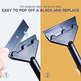 Razor Blade Scraper with 10PCS Blades: The package comes with plastic scraper and 10pcs replacement plastic razor blades. The plastic scraper's and blade's edge flares out, will fit in a tight gap. Long Handle and Comfortable to Hold: The handle is ergonomic and comfortable. The long handle gives you great leverage and control. The handle are designed to present from slipping, decrease stress on your fingers and hands. Safer than Metal Razor Blades: This is sharp enough to scrape of adhesive and such from plastic or glass surface without damaging the surface. Great scrapper for anything you don’t want to use a metal scraper for... pots, pans, cooktop. Easy to Replace the Plastic Blade: When it gets dull or chipped, toss and replace with a new blade. The handles hold the blades firmly yet are easy to remove and replace. Versatile Scraper Tool for Surface Cleaning: Great for removing labels, decals, stickers, gaskets, residues cleaning the stove top, counters, and so much more.