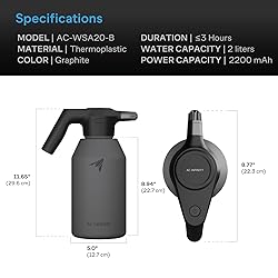 - Product DescriptionAn automatic spray bottle designed to help you water your plants with ease, featuring a single on/off button that is quick and easy to operate. This electric sprayer can continuously spray water for up to 3 hours, backed by its large 2200 mAh power capacity that can quickly be recharged. Its automatic spray is quiet and non-disruptive, powered by an efficient motor that generates low noise. You can adjust this spray using the nozzle tip to get a wide range of spraying patterns from a strong, focused waterjet to a fine mist. Its 2-liter capacity tank features a sturdy thermoplastic build that is resilient and resists cracking that results from exposure to outdoor elements and ultraviolet rays.ApplicationsThis electric mister is commonly used with water or foliar spray, ideal for gardening applications like lawn and plant fertilizing, weeding, and general plant watering. It can also be used with alcohol or disinfectant in general cleaning applications to effectively sterilize and disinfect surfaces around your home, workshop, office, car, and more.