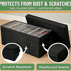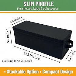Great Value Pack : Evelots set of 4 stylish black portable CD holders are a Sturdy & Protective CD storage box solution to keep your favorite music free of scratches and dust. Also, store Video games, Books, DVD and other media collections in these stylish fabric covered boxes Large Capacity : Holds up to 32 CDs in each box, making the grand total of up to 128 CDs and are Stackable Features : Strong polyester fabric carrying handles for ease in grabbing it from the shelf, transporting from room to room or to take along on vacation Easy : Storing your cds with label up provides ease in finding the CDs you want to listen to quickly. Measures approximately 13.5 Inches Long x 5.3 Inches Wide x 5.9 Inches High Based in beautiful Vermont, Evelots has offered Amazon customers unique products for more than 12 years with a 30-day easy return policy.