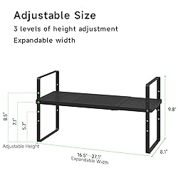 💕【Adjustable Shelves】This cabinet shelf organizer extends in length and adjusts in height to fit any space you need. The original shelf (collapsed) measures 16.5" L x 8.1" W x 9.8" H. The length can be extended from 16.5 inches to 27.1 inches. This expandable cabinet shelf provides three levels of board height adjustment from 5.7 inches to 8.5 inches. You can tailor each shelf with adjusting screws on both sides of the shelf frame. 💕【Expandable Design】This pantry shelf divider adopts a metal sheet structure with adjustable length from 17 inch to 31 inch. Available width is 11.8'' . Please note that the length of your closet should be within 31 inch.Please confirm the size you need before purchasing. 💕【Stackable Shelves】You can stack one shelf on top of another to creat multiple levels of storage space. You can choose 1, 2 or 3 tier shelving unit to meet your needs. The shelf stand is perfect for kitchen cabinets, pantries, countertops, under the sink or anywhere you need extra space to maximize storage and organization. 💕【Installation Without Drilling】The tension shelf insert can be wall mounted with super strong seamless sticker, which is not easy to fall off. All the installation hardwares are included and you can install it easily and quickly even if you have no installation experience before. 💕【Guaranteed Replacement】Customer satisfaction is our goal. Please feel free to contact us if you require any further information.