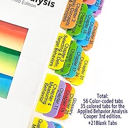 56 Colored tabs for the Applied Behavior Analysis Cooper 3rd edition.35 ABA Important Sections Tabs with 21 Blank Index Tabs and 1 Bookmark and Placement Template (Book Not Included) [TIME SAVING]: A page that tells you where to put each tab on so that you don't waste precious time flipping through the pages looking for the right regulations. The Tabs are removable when applying and will become permanent over time, so if you want to adjust the position when installing, you can remove flags and reapply. [EASY TO INSTALL] Perforated to allow easy fold and alignment. Double-sided flag technology allows you to view information on both sides of the logbook.Color-Coded, Easy to Navigate: Tabs of the same part are of the same or similar color, so it’s very easy for you to find different sections. PS: Only sell index tabs. [EASY TO READ AND WATERPROOF]: You can easily reference any book or passage with these tabs, which have clear print on both sides. We adopt high quality printing material, and all the tabs are laminated with matte film, so they are durable and waterproof, can last for long time. For easy reference: Colored tabs highlight the most important parts, so you can easily browse the Applied Behavior Analysis Cooper 3rd edition.