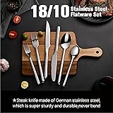 36PCS Silverware Set For 6 - Includes 6 dinner forks(8’’/1.6oz), 6 salad forks(6.7’’/1.24oz), 6 dinner knives(8.9’’/2.81oz), 6 steak knives(9.4’’/2.71oz), 6 dinner spoons(8’’/1.94oz) and 6 teaspoons(6.7’’/1.28oz). This silverware set is great for everyday use and also for a special dinner. Essential for families or restaurants Premium Stainless Steel - Our flatware sets are made of decent quality 18/10 stainless steel, nice balanced, sturdy and corrosion resistant. the steak knives made of German Stainless Steel to enhance its hardness for easy cutting and slicing Original Steak Knives - 6 additional steak knives with sharp serrations on the blades help it easy to cut meat, and original design steak knives perfectly matched with the flatware set Modern Design Cutlery Set- Mirror Polished Surface and Streamline Body Molding makes the cutlery set simple yet modern and easy to clean. Matches well with your existing flatware/dinnerware/tableware This shiny silver flatware set is perfect for Thanksgiving Day, Mother's Day, Housewarming, Wedding, Restaurant, Hotel or Daily Use. If you encounter any issue, just let us know and we always be ready to help Care Instructions: Dishwasher safe, though hand - washing is better for avoiding fingerprints. Keep hands dry when handling. If fingerprints appear, just wipe with a soft, dry microfiber cloth. No need to polish. Clean with lukewarm water, mild detergent, and a soft sponge or cloth. Rinse well and dry immediately. Don't use steel wire brushes, hard sponges, or other hard cleaners as they can scratch the surface and make fingerprints more obvious