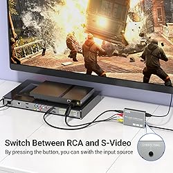 【RCA S-video to HDMI Converter】This S-video RCA to HDMI converter is designed to convert RCA or S-video + R / L audio signal into HDMI digital video and audio signal. 480i(NTSC) or 576i(PAL) standard definition signal input and 720P/1080P@60Hz HDMI output. Enables you to connect old devices with RCA/Svideo to new TVs with HDMI. 【4 : 3/16 :9 Aspect Ratio Switching】 This Svideo AV to HDMI converter supports 4 kinds of aspect ratio modes(4 : 3/16 : 9/16 : 10/Full). 4 : 3 aspect ratio mode for retro games, and 16 : 9 for DVD, streaming media player which need to be displayed at widescreen. 【720P/1080P Output Switching】Our converter also supports 720P/1080P@60Hz HDMI output switching. Select the output resolution by the switch button on the converter. 【Wide Compatibility】It's widely used with VHS, VCR, DVD player, Wii/NGC/PS1/PS2 and other devices with RCA/Svideo output to view on HDMI TV, projector or monitor with HDMI inputs. 【All Accessories included】 Our RCA Svideo to HDMI converter comes with all accessories needed in your connection. Inlcudes power adapter, RCA cable, Svideo cable, HDMI cable(Other brands usually don’t provide HDMI cable).