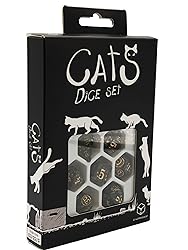 This set consists of 7 polyhedral dice: D4, D6, D8, D10, D12, D20, and D00. This dice set is kept in a bottle-green & gold color theme. The digits on these dice have cat's ears and are accompanied by yarn balls, milk bowls, and cat's paw trails! Each dice presents a different type of cat silhouette on its highest face! The CATS Dice Set: Pixel is produced in Poland, EU.
