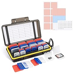 【High Capacity】This memory card case stores 24 SD/SDXC/SDHC and 18 Micro SD/SDHC/SDHC/MSD/TF cards with individual transparent plastic card holders (memory cards are NOT included), meet your daily memory cards storage needs. 【Strictly Tailored】The interior customized EVA foam features shock absorption and offers the utmost protection. The case inside features 42 plug-in slots for storing clear plastic memory cards case. Independent slot holds the item securely in its slot and keeps it safe from getting knocked around. This case allows you to keep cards more organized and at your fingertips. 【Double Protection】This memory card case is made of high-quality PC material and is pressure-proof, sturdy, and durable. It is water-resistant and can effectively keep dust free. The plastic clear case comes with snap-tight closure lid, which has good sealing ability. It can prevents moisture, dust, and debris from entering the case and damaging your cards. 【Multi-Color/Clear Case】It comes with transparent memory card holders in clear, red, and blue colors, 14 per color to meet your different color preferences. The contents of the memory card can be classified according to the color.Package also contains a sheet of label stickers for recording the card information. Easy to organize and retrieve cards, and provides a more convenient and orderly storage. 【Idea Choice】With a carabiner, it is easy to attach the case to backpack or hang it on a tripod, which is ideal for the convenience of your outdoor activities.