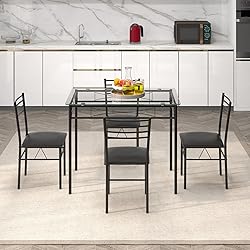 Modern 5-piece Kitchen Table Set: This 5-piece dining room furniture set includes 1 rectangular dining table and 4 chairs, which is ideal for daily meals, afternoon teas, etc. Featuring a modern simple style, the dining table set will blend into various home decors. High-grade Glass Dining Table: The dining table comes with a durable tempered glass tabletop that resists impact, deformation and stain. You can simply wipe it clean with a damp cloth. Besides, the round table corners provide added security in daily use. Comfortable Sitting Experience: The chair features a high-density sponge padded seat and skin-friendly PU leather cover, making you not feel tired when sitting for a long time. Plus, the ergonomic slanted backrest can provide great support for your back. Heavy Duty Construction: Constructed from solid and thickened metal tubes, the dining table and chairs are sturdy and not easy to wobble or deform. What's more, the decorative metal bars also enhance overall stability. Easy Storage & Assembly: This compact dining table set for 4 is an ideal choice for small spaces, apartments, kitchens, dining rooms, etc. 4 chairs can be tucked away under the table after the meal to save a lot of space. Moreover, with clear instructions, it is simple to assemble.
