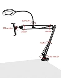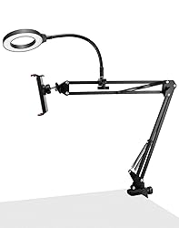 Versatile Lighting Solution: A 6-inch ring light offering 3 distinct lighting modes, each featuring 10 adjustable brightness levels, perfect for enhancing visuals in vlogging, content creation, and live streaming. Flexible Setup: Equipped with a 360-degree swivel ball head and an adjustable arm with a ball joint, allowing for precise positioning at varied heights and angles to meet your creative demands. Broad Compatibility: Provided with a universal 1/4 threaded head, making it compatible with all iPhone models, popular Logitech webcams and other lightweight devices. Robust Clamp Design: Securely attaches to desks, the desktop can hold up to 1-9/16" in size. The phone holder has an adjustable range of 4-1/2" to 7-1/4". Portable: Lightweight tripod construction designed for on-the-go content creators, powered via USB connection for convenience across various set-ups and locations.