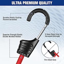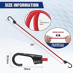 Excellent Strength and Elasticity: WORKPRO Outdoor Heavy Duty Bungee Cord, each bungee cord is constructed from high-quality PP wire and rubber core, ensuring superior strength and stretch as needed. It can be used indoors and outdoors Wide Applications: Bungee cord is 24 inches (60 cm) long and 8 mm wide. It has an advantage in both length and width over ordinary bungee cords. It has stronger carrying capacity and can meet your higher requirements. These heavy duty bungee cords are highly elastic and supportive and are compatible with bags of all sizes and weights. Compatible with all bikes, cars, carts, luggage racks, camping, gardening, clotheslines Durable Hook: Durable plastic coating prevents scratches, and each rope has a 3.5mm thick steel core inside, ensuring strength. It is not easy to deform after long-term use Efficient and Reliable: This bungee cords has 2 times tensile strength, and strong resilience, the cords are thickened to 8mm, threaded design, are beautiful and generous, more durable than other flat luggage ropes Caution: This bungee cord cannot be used for rock climbing and river tubing. Keep vulnerable body parts out of the potential rebound path and do not stretch the cord beyond 100% of its unstretched length
