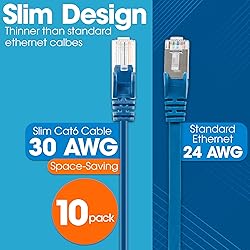 Thin Size: Its thin slimrun size helps promote better air circulation to equipment in a network cabinet. Also makes it a perfect choice for installation around corners and in tight-space cable runs. Snag Free Boot: Has a rugged PVC jacket and snag-free boots to ensure connections remain in place with full data transfer rates, error-free transmissions and maximum conductivity. Fast 10G Data Transfer: RJ45 male connectors have 50 micron gold-plated contacts that allows for Gigabit network speeds and provides superior corrosion resistance. Cat6 with 10G / 1G and 250 MHz. Compliance Standards Tested: Has all the benefits of a standard Cat 6 LAN network cable cord but with a diameter that's considerably smaller in size. Standards & Certifications are ETL, UL, ISO/IEC 11801 & EN 50288 & TIA/EIA 568C.2. Built to Last: Lifetime Manufacturer Warranty