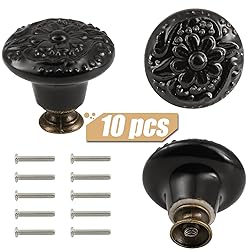 *Purchase Guiding* 10 x Black Ceramic Flower Knobs with mounting set. Knob size: 1-3/8" x 1-1/4"(Dia.* L). Mounting hole depth is 5/16" / 8mm. 10 x Regular Screws 1" / 25mm. *Vintage Appearance* Elegant appearance, antique design and exquisite craftsmanship make it not only beautiful and stylish when collocated with modern furniture, but also add a classic charm to your home. *Durable Quality* The drawer knob is made of ceramic, which is sturdy, durable, and easy to maintain. It is an economical and practical home decoration, and easy installation is a good choice for DIY projects. *Wide Applicability* The relief pattern and simple design is suitable for many kinds of furniture such as kitchen cabinets, drawers, cabinets, doors, drawers, wardrobes, home dressers, offices and many other uses. *Comfortable Purchase* If you have any questions about our products, please contact us by email in Amazon, in order to provide our customers with a comfortable purchasing experience, we will reply you within 24 hours.