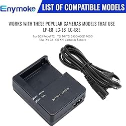 - Charger Specifications Input - AC 100-240V 50Hz/60Hz 0.24A; Output Voltage:DC 8.2V 0.68A, LED lights that shows the charging status. Compatible Models: Compatible with LP-E8 LC-E8 LC-E8E battery for Canon EOS Rebel T2i, T3i, T4i, T5i, 550D, 600D, 650D, 700D, Kiss X4, X5, X6i, X7i Cameras and More. Note: Please check your camera model and more detailed information before buying. If you have any needs, please contact us in time.Thanks!