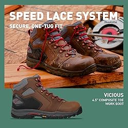 Danner's Rugged Craft: Danner Vicious Composite Toe Work Boots for men combine full-grain leather with advanced GORE-TEX technology for exceptional waterproofing. These work boots for men provide durable protection in challenging outdoor environments Composite Toe Safety: Designed with a non-metallic composite toe, these boots deliver reliable safety without setting off metal detectors. Ideal for work environments where electrical hazards are present, they meet ASTM F2413-18 standards All-Terrain Stability: The Danner Trailguard TPU shank provides stability and underfoot protection on uneven terrain. With slip-resistant Vibram soles, these boots for men enhance traction across various surfaces, making them suitable for rugged work conditions Breathable Waterproofing: Featuring a GORE-TEX lining, these work boots keep feet dry by blocking water while allowing moisture to escape. This ensures comfort during long hours on the job or in outdoor adventures Electrical Hazard Protection: These men's work boots feature non-conductive soles and heels, providing protection from electrical hazards. Built for durability, they are a reliable choice for electricians and outdoor workers alike