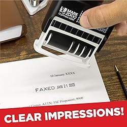 • This Mark 2000 12-Phrase Dater offers 12 essential phrases: Approved, Urgent, Emailed, Cancelled, Charged, Checked, Delivered, Credit, Faxed, Paid, Received, and Shipped. With its 10-year guarantee and band shield technology, this stamp ensures long-lasting performance and mess-free operation. Plus, enjoy thousands of impressions before re-inking is necessary.