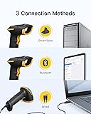 1D and 2D Barcode Supported: Easy to read mainstream 2D barcodes and all 1D barcodes including those with unintended abrasions or surface stains Screen Scanning: Equipped with CMOS sensors, BCST-54 can read barcodes off sceens Smart Base: This Bar Code Scanners can be connected with a computer via the USB cable provided to recharge the scanner or transmit barcode data to the computer 3 Connection Methods: Connected with a computer via the included USB cable for plug and play(no configuration required); connected via the smart base for wireless mode(paired by default); connected via Bluetooth to work with mobile phones, tablets, etc(manual configuration required) More Functions: Vibrate mode, inventory mode(capable of saving over 270,000 barcodes in buffer) and more to meet your various needs