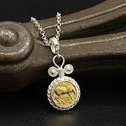 Made of 925 sterling silver and stamped, it is a designer fine piece of art pendant featuring 24K gold vermeil reproduction ancient horse bronze coin This handmade coin pendant measures 1.34" (34mm) in length included pendant bail and 0.63" (16mm) in width widest part included twisted rope setting, comfortable and suitable for women and men Silver is shiny, bright, timeless, trendy. It is universally used in jewelry making, this handcrafted ancient coin pendant made of 92.5% pure sterling silver s925 and stamped (925), free of lead and nickel, hypo-allergenic to sensitive skin, stylish and safe, it is anti-allergic and non-fading, this sterling silver pendant is hammered, hand forged, forging is a traditional jewellery making technique that has been used for centuries This artisan pendant is timeless and unique gift for who appreciates quality and craftsmanship, this attractive roman art jewelry is an ideal holiday gift for anniversary, birthday, valentine’s day, graduation or mother’s day, gift for wife, husband, sister, aunt or special someone, please visit our store to browse one-of-a-kind sterling silver men's rings, signet rings for women, turkish jewelry for women, mens signet rings and very popular coin jewelry We are a turkish silver jewelry manufacturer, wholesaler & exporter, we pride ourselves in providing our customers with a superior service, please feel free to contact us if have any questions or needed further assistance