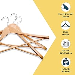 FUNCTIONAL SOLID WOOD DESIGN: Crafted from premium wood, these hangers offer both functionality and elegance, providing a sophisticated solution for organizing your wardrobe. HEAVY DUTY SUPPORT: With a robust construction, these hangers ensure reliable support for suits, jackets, pants, and dresses, making them an ideal choice for heavy garments. WIDE SHOULDER EXCELLENCE: The extra-wide shoulder design prevents wrinkles and is specifically tailored to accommodate suit jackets, preserving their shape and integrity. FRUSTRATION-FREE HANGING: Enjoy an effortless closet experience with the chrome 360° swivel hook, allowing easy access to your clothes from any angle and streamlining your daily routine. VERSATILE AND AESTHETICALLY PLEASING: The pants bar design adds versatility to your closet organization, while the natural wood grain finish enhances the overall aesthetic appeal of your wardrobe, creating a visually pleasing and organized space.
