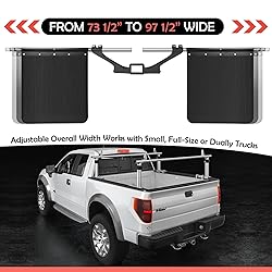 Truck mud flap adjustable system for 2", 2.5" and 3" receivers hitch, adjustable height and width, suitable for use on most vehicles from small to dual purpose. Protects your trailer or vehicle from damage caused by road debris and debris Truck mud flap can range from 73 1/2" to 97 1/2" total width, fender height can be adjusted by rotating the wheel hub, fender flaps 24"*24", can be cut to the size you need. Suitable for various models It was Designed for Long Life In the Most Severe On and Off-Road Conditions. Ideal for all-season use;enough to maintain appearance and anti-sail properties. It can resist buildup of ice and snow and repel the road debris Adjustability makes it Fits most trucks and pickups, including boat trailers, travel trailers and so on,our adjustable sleeve system works on all 2", 2.5" and 3" receivers, please make sure that the size of the product is the size you need before purchasing Package:Heavy-Duty Mud Guards Splash Flaps, 2.0 Adapter* 1, 2.5 Adapter* 1, Flap Fastener*2, MF Flap Tube*2, MF Hitch Bracket*1, MF Pivit Arm*2, Bubber Flap*2, 0.5 - 13 Lock Nut* 10, 0.5 - 13 1.*5 Carriage Bolt* 10, 0.75 Lock Washer* 2, Hex Bolt *, nut * 4, Flat washer*2 and MF Bar End Cap*4