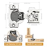 Installation Specification: Cup diameter is 35mm; Cup depth is 11.5mm, Screw holes distance is 45mm; Opening angle is 105 degrees, suitable for most cabinet door styles. Each slow close cabinet hinge comes with 2 easy-on dowels and 3 self-tapping wooden screws to ensure a perfect fit. SOFT CLOSE CABINET HINGE: Each overlay concealed cabinet hinge includes a built-in POM damper, Reduced closing speed prevents noises from the kitchen and prolongs the life of doors, cabinets, and hinges. In addition, it also supports ★SMALL SOFT CLOSE ANGLE★, which can better protect your finger. 3 Ways Adjustable Upgrade: Superior 3D adjustability allows you to adjust the cabinet door up and down, left and right, back and forth just by turning a screwdriver, this will ensure that your bathroom and kitchen cabinet doors do not sag, and align correctly, open and close smoothly. Double Electroplated: The material of our overlay cabinet hinges is high quality steel and nickel plated finish and brass plated bottom, durable and perfect for kitchen cabinet doors, wardrobes, and TV cabinets, bookcases, wine cabinets, and other luxury door connections. Buy with Confidence: Chibery hinges Conform to the standards and certifications of ISO9001, ISO14001, BHMA, KCMA, and SGS. The product can withstand more than 100,000 times of opening and closing and more than 48 hours of salt spray test. If you encounter any problems in the process of use, please feel free to contact us, we will provide the most intimate service.