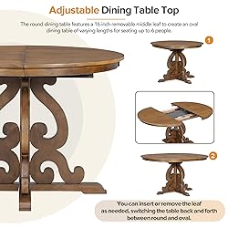 [Retro Round Dining Table Set] The retro feature dining table includes an expandable dining table and four matching upholstered chairs that mix understated elegance with a rich retro feel. The legs and backrest of the tables and chairs are made of symmetrical hollow carving patterns. It is available in two colors, antique white and walnut. No matter which color of cutlery you choose, it will be the finishing touch of your dining room, kitchen or dining room. [Extendable Kitchen Table Set for 4-6] The round dining table features a 16-inch removable middle leaf to create an oval dining table of varying lengths for seating up to 6 people. The total length of the dining table is 58 inches, with the middle leaf removed the length becomes 42 inches. You can insert or remove the leaf as needed, switching the table back and forth between round and oval. I believe the adjustable design will bring convenience to your life to a great extent. [Exquisite Craftsmanship] Our wooden dining table has a glossy painted top and double seated legs. In the design of delicate and gorgeous symmetrical curved pattern, the dining table is full of retro atmosphere. In addition, exquisite chair backs featuring cut-out patterns and metal decorative studs greatly add vintage style to your home decor. The unique design not only adds a beautiful set of furniture to your room, but also presents a unique refinement in workmanship. [High Quality Material] Desktop with high quality MDF and grey finish, smooth and durable. The legs are made of solid wood LVL and are strong enough to support you and your family. All four chairs are wrapped in linen as cushions and filled with soft foam to provide a comfortable sitting experience. The thickness of the chair is 60 mm. The load-bearing capacity of the tables and chairs is 222 LBS and 250 LBS/PCS respectively. [Dimensions and Assembly] Table: 42-58"L x 42"W x 30"H, 99 LBS; Chair: 22"L x 18.9"W x 38"H, 16.5 LBS/PCS. This dining table set comes with detailed instructions that can be followed step by step to help you complete the assembly as quickly as possible. Any damage during transit or any defects after receipt will be covered. If you have any questions, please feel free to contact our customer service.