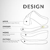 Faux leather or metallic criss-cross slide Synthetic lining Signature ultra comfort EVA insole Cork 2.75” wedge with rubber traction outsole Rubber outsole for traction