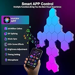 Smart APP and Remote Control: Install the matching APP on your mobile phone, you can turn on/off the hexagonal led light, change the color, adjust the brightness to get the effect you want through the mobile APP, the operation is simple. Over 16 million colors can be switched at will to enhance the ambience. At the same time, the hexagonal light is equipped with a remote control that provides you with double protection and is more convenient for daily use. Synchronized with music: voice-activated induction, turn on the microphone mode, the light "beats" with the rhythm of the music, feel the double rhythm of the music and the light. The lights interact in sync with the music, turning the room into a dance floor, allowing you to fully feel the beat of each music. You can choose the lighting and music style that suits you. The hexagonal wall lamp can receive the frequency of music, clapping, and the voice of speaking changes color. Free DIY: The hexagonal wall light contains 8 separate panels, which can be spliced into different shapes at will. The hexagonal template design is spliced like building blocks, inspiring wireless imagination, inspiring the artist in your heart and letting you feel the fun of DIY. Better looking and more fun. Create a cool experience space. More Uniform Light Effect: Hexagon light adopts unique RGB technology, which makes it more uniform and colorful than the light emitted by RGB. Made of high-quality frosted and sprayed plastic, it emits more delicate light, soft and spotless. Multi-scene USB connection: The hexagonal wall lamp adopts USB connection, and the USB power supply can be connected to mobile power supply, computer, and notebook, which greatly expands the use scene of the hexagonal lamp. The splicing hexagonal lamp can be used for children's enlightenment and is an excellent wall lamp to accompany children's growth. Not only for boys and girls, but also for adults, creating a fantastic atmosphere for playrooms, bedrooms, offices.