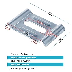 • Specification Material: Carbon Steel Q235B Finish: electrogalvanized Clamps width: 2" (50 mm) Thickness: 1.2mm Slot hole size: 31.5 x 8.5 mm, fits 5/16" bolt Fit for the wire diameter of basket cable tray: 4.0-6.0mm Product size: 63x39x50 mm Weight: 23g per clamp, 695g for 30pcs clamps Packing List 30 x Hold Down Clamps for Cable Tray