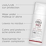 - EltaMD UV Clear Face Sunscreen SPF 46 is an Elta MD sunscreen for your face that is designed to provide broad spectrum sunscreen protection against UVA and UVB rays. This sunscreen lotion incorporates transparent zinc oxide sunscreen that leaves no white cast. Ideal for sensitive skin, this unscented sunscreen is oil-free, paraben-free, and suitable for acne-prone skin. This dermatologist-recommended sunscreen serves as both a facial sunscreen and a sunscreen for acne-prone skin. Perfect for frequent travelers, the convenient travel-size 1.7 oz pump makes it easy to carry. This sunscreen for face can be applied alone or under makeup, for sun protection without the grease.