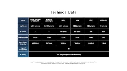 The Nitecore EDC torch has 5000 lumens and a range of 550 meters for outstanding brightness Built-in 21700 Li-ion battery: rechargeable torch with 6000 mAh for long service life and reliability [Safe Operation]: Mechanical lockout system and the two-stage switch ensure easy handling [Versatile momentary light functions]: Lumin Shield TM (5000 lumens) and search (3000 lumens) for different requirements [Robust and waterproof]: IP68, aviation aluminium housing, ATR temperature control, USB-C charging port for long-lasting use