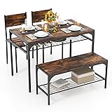 REINFORCED CONSTRUCTION: Crafted from solid metal and thick board, our table set boasts a heavy-duty metal frame capable of supporting up to 200 lbs for the table, 330 lbs for each chair, and 660 lbs for the bench. This industrial dining set ensures exceptional durability and sturdiness. PERFECTLY FOR SMALL SPACE: Chairs and bench are able to be stored underneath the dining table to save space while it is not in use. It is very easy to keep everything in order and tidy once owning this 4 piece dining set with bench at home, kitchen, living room and dining room. AMPLE STORAGE SPACE: Tangkula dining set for 4 features a storage rack on the bench, maximizing your home spaces. You can conveniently display dishes and utensils under the tabletop for easy access, while the bench provides ample storage for larger items. VERSATILE USAGE: Our 4-person dinette is versatile and ideal for various occasions, serving as a modern and stylish dining table in your home or can also function as a practical desk, catering to your everyday needs. EASY ASSEMBLY & MAINTENANCE: Assembly is a breeze with all parts included and detailed instructions provided. The smooth bottom feet prevent floor scratches, and the waterproof tabletop is easy to maintain by wiping clean with a damp towel.