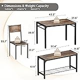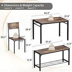 Multifunctional Use - The rectangular dining table can not only be used as a kitchen table set, also be used as a computer desk, dining table, office table, writing desk, bar table and etc. After multi-channel grinding process, the surface of this table set keeps the natural texture of solid wood, smooth and easy to clean. Space-Saving Dining Set - The modern 4-person dinette comes with a rectangular dining table, 2 wooden chairs and a bench, creating the perfect dining experience for friends or family, the chairs and bench can be moved underneath the table after dining. In addition, the design of the storage shelf under the bench will provide more storage space for your daily necessities. Hard-Wearing - This 4 Piece Dining Table Set, it's made of sturdy thick boards and heavy-duty metal frames, which ensures greater stability for longer life. The dining table seats are ergonomically designed to provide you with a better dining experience. Dining Table Set for 4 - Table size: 43.3"(L)*27.6(W)*29.9(H), Capacity: 200 lbs; Chairs size: 17.3"(L)*15.4(W)*33.7(H), Capacity: 300 lbs; Bench size: 37.4"(L)*11.8(W)*17.9(H), Capacity: 300 lbs. Easy Assemble - We come with detailed installation instructions as well as toolkit for kitchen table chairs set, easy to operate. All parts are marked with either a letter or a number, and the instructions show exactly which parts should be used.