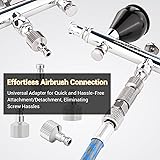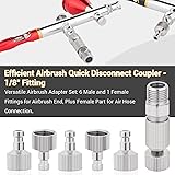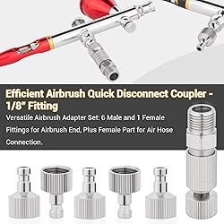 【Package Contents】 Included in your purchase is an airbrush quick release coupling disconnect adapter kit, comprising 5 pieces of 1/8" male connectors and a 1/8" female connector. These components are tailored to meet your daily airbrushing needs with convenience and versatility. 【Enhanced Sealing Performance】 Our quick disconnect fittings employ flat O-rings to seal the airbrush, providing a superior flat contact surface compared to round O-rings. This design ensures a tighter, more effective seal than conventional options. Furthermore, our products undergo rigorous testing over extended periods to guarantee optimal sealing reliability. 【Functional Utility】 Our quick release device simplifies the process of attaching the air hose to the airbrush. When disconnected, it seamlessly cuts off the airflow within the hose automatically. This intuitive design ensures both ease of use and practicality in your airbrushing endeavors. 【Ease of Use Simplified】With our quick disconnect feature, connecting and disconnecting the airbrush is effortless, eliminating the need for screws and reducing any potential hassle. 【Efficient Quick-Release Design】Our quick-release mechanism enables swift airbrush changes, making it exceptionally convenient when utilizing multiple spray guns. This feature enhances workflow efficiency, providing seamless transitions between different airbrushes to meet your diverse needs effortlessly. 【Versatile Compatibility】Designed to accommodate most airbrush models, our airbrush quick release connector includes an accessory adapter for airbrush quick disconnect, ensuring suitability for a wide range of applications and airbrush types.