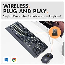 EXTRA LARGE, HIGH-CONTRAST KEYS: Yellow large print design for ease of visibility, making this keyboard ideal for visually impaired users and the elderly who need low vision keyboards. SEAMLESS 2.4GHz CONNECTION: Pairs the keyboard and mouse using a single USB-A dongle, providing smooth performance up to 33 feet away. WIRELESS KEYBOARD AND MOUSE COMBO: Includes an integrated wrist rest and adjustable kickstands, ensuring comfortable typing and navigation for extended use.. ERGONOMIC WIRELESS MOUSE: Features adjustable DPI settings (800, 1200, 1600) for smooth and precise navigation, providing comfort for your hand. COMPATIBLE WITH WINDOWS AND CHROME OS: No software is needed. Batteries for both the large-print keyboard and wireless mouse are included. Simply connect and start using.