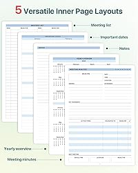 Master Every Meeting: If you tired of losing track of meeting notes, this meeting notebook will be the perfect solution to help you stay organized. This meeting notebook empowers you to capture ideas, track action items and maximize productivity. Stay organized, stay focused, and make every meeting count with this meeting notebook Professional Layout Making note-taking a Breeze: this meeting notebook includes Meeting List, Calender&Important Dates, Meeting Minutes & Notes. Professional designed for easy recording of key meeting details such as date, location, objective, and attendees. Index pages enable easy categorization and quick access, enhancing overall meeting and project management efficiency. Say goodbye to messy notes and hello to an organized and efficient way of keeping track of your meetings. This all can help you get more effective meetings and good results Ample Space and Great Functional: With a 2-page layout per session, you will get plenty of space to record all the meeting notes. It also features some lined and dotted notebook pages for you want to keep notes on specific entries. With an inner pocket for you to collect meeting materials anywhere. This project management notebook is a thoughtful and trustworthy companion whether you are traveling to and from work or a meeting Dueable and Easy to Carry: This notebook for work meetings is made of fine leather cover and thick paper, strong and durable, not easy to bend, with waterproof function, it can be last and protect your notes. The pen sleeve on the side is convenient for taking meeting notes by a pen at any time, and the strap set on the back protects the inner pages from falling apart easily Meeting Organizers: The Work Planner Notebook is designed to lay flat. Keeping you organized and writing comfortably in a fast-paced professional setting, this meeting planner comes in five colors to suit different people and usage scenarios. Besides, everything is neatly zoned on each page makes it a breeze to fill them out and ensure all you need are accounted for, and these detailed and thoughtful designs make it easy for you to take meeting notes and efficiently keep track of your work. Try this meeting notebook for work and let it be your best partner to keep your work organized and efficient