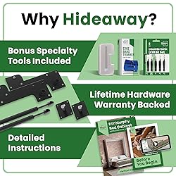 High Quality Powder Coated Steel Hardware: The Queen size murphy bed kit comes with sturdy hardware capable of holding up to 550 lbs on the murphy bed frame. This Queen Hideaway bed kit is a durable space saving furniture solution. XL, In-Color, and Easy To Follow Instruction Guides: Our booklet is 80% larger than a standard 8.5x11"". It's linked to detailed animations to make it a diy murphy bed project suitable for slightly-beyond-beginner DIYers to intermediate skill levels. An Affordable DIY alternative to Pre-built Murphy Beds: You won't find a queen size murphy bed on clearance, but you can build one in a weekend for a fraction of the cost. Our murphy bed hinges and hardware make building a pull down bed easy. Hideaway Includes Specialty Tools You'd Have to Purchase Elsewhere: An edge band trimmer, and forstner & countersink drill bits are required for any queen size murphy bed cabinet DIY kit. We're the only ones that include them - saving you money! Lifetime Warranty On All Foldable Murphy Bed Hardware: The Hideaway murphy wall bed queen hardware kit is covered by a lifetime warranty and supported by USA-based customer service.