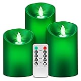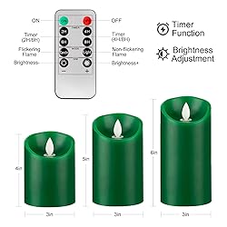 [ Green Flame Candles ] – our green candles not only have green body, but also have green LED light source, therefore the flame color is also green, great for party, Christmas and Halloween decoration (Important Notes: the flame color is green, not white) [ Moving Wick Design ] - when you turn on the LED flameless candles, the candle wick would move forward and backward, it looks like dancing flame, very realistic and beautiful! (please watch the video on the page for your reference) [ Safe LED Flameless Candles ] - the LED flameless candles are made of real wax (avoid using in high temperature area), no smoke, no fire rise, safe for your home and family (Important Notes: the candle body color is similar to dark green, please watch the product photos on the page carefully before you buy) [ Remote Control with Timer and Dimmable ] - the remote is included in the package! You could use it to adjust the brightness, or set 2H/4H/6H/8H timers, very convenient [ Battery Operated ] - cach candle is powered by 2*AA battery (not included in the package). If you buy high performance battery, the illumination time can last more than 200Hr
