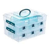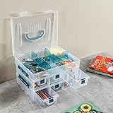 Premium quality clear plastic empty stackable utility bin with blue accents, 24 customizable compartments, and a top carrying handle for portable storage Interchangeable design: organizing case snaps together in three sections using the side buckles, including a top tray with a lid and 2 drawer trays to display separately or store together 6 secure drawers of this multipurpose tote open by squeezing the handle, and have removable dividers to accommodate arts & crafts supplies, sewing or knitting tools, and more Double concave top ridges and convex bottom feet allow for multiples of this container to be stacked for space-saving storage and organization in any household, workspace, or dorm **Made in Taiwan** Approximate Dimensions: Overall - 11.5 L x 8.9 W x 7.1 H (in inches)