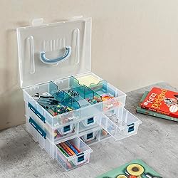 - Keep your crafting and sewing supplies organized and ready to use inside this blue and transparent empty organizing case. This organizer features 24 adjustable compartments, so you can create the perfect storage solution for your needs. Also included are 6 drawers, which are ideal for keeping smaller items like buttons, washi tape, and letterboard letters. The drawers have removable dividers, so you can easily change them up to fit different sized tools. Featuring premium quality clear plastic construction, this see-through accessory holder allows you to view its contents making things easy to find while the blue accents add a touch of modern style. Great for storing everything from thread and needles to beads and charms, this multipurpose tote is useful for any hobbyist or collector. With its convenient stackable design, you can add-on more containers as your collection grows. A top carrying handle on this portable case makes it a fine choice for traveling makeup or face paint artists, as well as art students and seamstresses. A necessity for home and on the go, personalize this functional and customizable caddy to specific hobbies and keep items on hand. A drawing kit, cute cosmetic box, or fishing tacklebox, this multifunctional utility bin is a thoughtful gift for anyone for any occasion.**Made in Taiwan**Approximate Dimensions: Overall - 11.5 L x 8.9 W x 7.1 H (in inches)