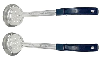 Stainless Steel Construction - 2 Perforated / Slotted Portion scoops. These portion control scoops are designed for commercial kitchens and food service estalishments. They are sturdy and will not easily bend. Ergonomic, Comfortable Black Handles - Non slip handles will not heat up on steam tables. Contoured finger grips make these comfortable to use for long services. Reduce Food Waste - Keep control of your portions with these 6 oz (3/4 Cup) portion control spoons. The perforated scoops are great for straining excess liquids when serving. Save with a 2 Pack - Great value for two high quality spoodles. They are dishwasher safe and are built to last. Satisfaction Guaranteed - If you are not 100% satisfied with your purchase, simply contact us and we'll replace or refund the order.