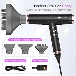 【2000W Powerful High-speed Motor, Super-fast Drying】 slopehill professional hair dryer features an airflow of 26 m/s and a speed of 110,000 RPM, suitable for salon and home. Compact and stylish brushless hair dryers is more suitable for women 【Bio Ceramic and Ion Hair Care Technology】 Ionic hair dryer delivers 30 million negative ions per second with a steady distribution, using 100 times per second of sophisticated temperature control. Static electricity is reduced with a blow dryer using far-infrared heat, leaving hair lustrous and soft 【Quiet & Portable】 The noise level of a small hair dryer is under 75 dB. Travel is made easy by the little dryer's portability and weight (0.75 pounds/340g). The wind direction and heat setting are shown on an LED indicator. For flexible hairstyling, a blower offers 12 various combinations of four temperatures (cold air), three wind speeds, and one direction 【Automatic Cleaning & Memory Function】 The rotating hair dryer has a removable filter with an automated cleaning feature and a 360-degree magnetic attachment connection. When the curly hair dryer is turned on again, its built-in memory feature will activate the previous setting 【Fuse & Low Radiation】 Protection plug on diffuser hair dryer protects against leakage and overheating. Intelligent constant temperature output heat, better styling. Low radiation is safe for children and pregnant women. Friendly customer support: read user manual. Please tell us if you have any questions about hairdryer