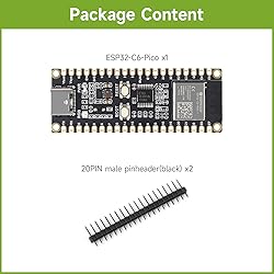 Adopts ESP32-C6-MINI-1 chip with RISC-V 32-bit single-core processor, capable of running at 160 MHz Integrated 320KB ROM, 512KB HP SRAM, 16KB LP SRAM and 4MB flash Integrated 2.4GHz Wi-Fi and Bluetooth LE dual-mode wireless communication, with superior RF performance. Type-C connector, easier to use. Onboard DC-DC chip MP28164, high efficiency DC-DC buck-boost chip with load current up to 2A 20 × multi-function GPIO pins and 7 × expanded IO pins. Rich peripheral interfaces, including full-speed USB OTG, SPI, I2C, UART, ADC, PWM, etc. to achieve various functions flexibly Castellated module allows soldering directly to carrier boards Supports multiple low-power operating states, adjustable balance between communication distance, data rate and power consumption to meet the power requirements of various application scenarios Supports most of the Raspberry Pi Pico expansion board ecology, suitable for artificial intelligence IoT application development