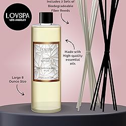 - LOVSPA® Fragrances Amber RomanceDiffuser Oil Refill SCENT PROFILE – Warm Amber, Sandalwood, White Lily, Jasmine, and Peony. WHAT’S INCLUDED: Comes with 2 sets of 8 replacement reed sticks and one 8oz diffuser oil refill—everything you need to refresh your scent diffuser setup. LONG-LASTING PERFORMANCE: Each 8 oz bottle of fragrance oil for diffuser delivers 6-8 months of continuous scent—perfect for home, office, dorm, entryway, foyer, or nursery décor. NO-FUSS REFILLS: Simply remove the cap and pour into any glass diffuser bottle, jar, or vase—no funnels needed for a quick, mess-free refill. REFILL & REFRESH: Our aromatherapy diffuser refill oil is made with premium essential oils for long-lasting fragrance; a flame-free, plug-free way to enjoy clean, fresh room scent. MULTI-PURPOSE USAGE: Use with reed diffusers, air diffusers, room sprays, aroma diffusers, potpourri, candle fragrance oil blends, electric machines, and more. CURATED SCENT COLLECTION: Explore boutique-quality hotel essential oils for diffuser, hotel fragrance oils, and hotel-inspired scents for home and spa settings. HOME FRAGRANCE SOLUTION: A clean, effective alternative to plug ins and sprays—enhance your reed diffuser, home fragrance, or room scent diffuser routine. GIFT-WORTHY CHOICE: Bundle with your favorite diffuser for an ideal gift for women, men, teens, housewarming, new home, holidays, or Mother's Day. ALTERNATIVE USES: Our refill oils can revive homemade potpourri with just a few drops of scented oil, transform into a DIY car air freshener by applying hotel or candle fragrance oil to a piece of wood or felt, be used as a quick room spray when poured into a spray bottle, boost vacuum filters for a fresher clean, or freshen trash cans and diaper pails by placing an oil-dipped cotton ball at the bottom.