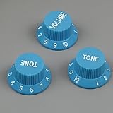 1 volume 2 tone speed control knobs fit ST style electric guitar parts replacement. The top of the knob: approx. 17.5mm diameter. The bottom of the knob: approx. 25.5mm in diameter. Height: approx. 13.5mm high. The central hole is approx. 6mm in diameter. Material: high quality plastic, durable and stylish. Scale:10 scales. Color: skyblue with white digital scale.