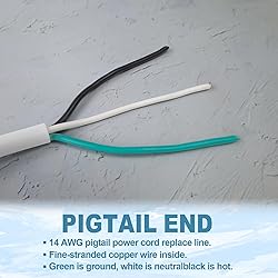 Flat Plug - The heavy duty dryer cord can fit with the wall, saving space, can also be used in narrow places Replacement Power Cord - 14-AWG, 3-Wires, SJTW, 15 Amp, 125V, 1875 Watts max applications. Pigtail End - 14/3 replacement power cord plat plug male to bare end ( ONE END ), which has open wiring on the other end. Safe Cable - UL Listed, Insulation stripped for easy connection and installation.3 prong grounded plug for added safety. Professional, safe, heavy duty and reliable. Wide Application - This Replacement Cord is Perfect for Powering Everything From Air Conditioners to Dishwashers, Dryers, Refrigerators, Power Tools, Lawn Mowers and More.
