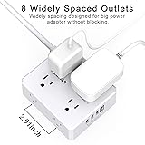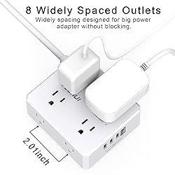 8 Outlets Power Strip with 4 USB Ports:The 3-side power strip with 8 AC widely outlets and 4 USB Charging Ports(Total 5V/4.2A), Each USB A port features 5V/2.4A Max output. USB C Charging Port features 5V/3A MAX. Power up to 12 devices simultaneously.Wide range voltage design, can be used on 120v to 240v circuit. 3 Side Design Surge Protector Power Strip with Wide Space:3-side design that makes it easier to make the plugs not covering any outlet, and the 8 AC outlets with 1.78 inches long space in between, larger than standard 1.5-inch socket. Larger spacing makes it easier to use for all kinds of equipment. The compact design saves more space, suitable for the home, office, and college dorm room. 20 Ft Flat Plug Extension Cord with Cable Ties:20 Feet Right Angled Flat Plug power cord makes it more flexible, Reusable Fastening Cable Ties Can tie up the unused cord and make it better organized. The two mounting holes on back allows this power strip to be securely installed in various applications. Multi Safety Protection:ETL Certificates. This power strip has overload protection, short-circuit protection, over current protection, over-voltage protection and overheating protection. The surge protector with overload protection protects your electrical appliances from lighting, surges or spikes. The minimum energy-absorbing capacity of 900 Joules. It will automatically cut power to protect connected devices when voltage surge is overwhelming. Our After-Sale Service:Our friendly and reliable customer service will respond to you within 24 hours. You can purchase with confidence, with our 30-day return and 12-month warranty.