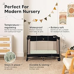 - Introducing the KeaBabies 2-Pack Isla Protect+ Waterproof Mini Fitted Crib Sheet, where thoughtful design meets the needs of parents seeking comfort, convenience, and style. These pack and play sheets fitted are made to perfectly fit nursery crib mattresses sized 38” x 26” with height up to 5”, adding a cozy touch to any nursery. Crafted from 100% viscose derived from bamboo, these pack n play sheets fitted are incredibly gentle and softer than cotton, creating a welcoming space for newborn's sensitive skin. The mini crib mattress sheet cradles your baby with the utmost care, ensuring that every nap and sleep is comfortable, bringing a sense of peace to those precious moments. Our mini crib sheets for boys and girls go beyond comfort with a special waterproof layer that quietly shields the playard mattress from diaper leaks, spit-ups, and little mishaps. This means no extra mattress protector is needed, making your life easier and keeping laundry loads lighter! You can now focus on enjoying every cuddle while knowing your baby's sleep environment stays dry and clean. We’ve designed these pack and play toddler bed sheets with SnugFit Tech, a smart fabric knit that stretches effortlessly, allowing easy fitting and removal without struggle. This ensures the mini waterproof crib sheets fitted hug the mattress securely, creating a safe and cozy sleep space for your baby. No more wrestling with unyielding fabric—just a simple, smooth fit every time. Crafted with quality finishes for lasting durability, machine washable and dryer-friendly, they’re a practical yet lovely addition to your nursery, providing comfort and protection as your little one grows. The gender-neutral design suits boys and girls, allowing these Pack N Play crib sheets girl and boy to blend seamlessly into any nursery décor. Let these fitted baby sheets for playard be a part of your family's story, bringing love and care to your baby’s sleep, while also serving as a dog bed cover for your furry friends.