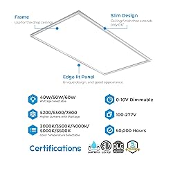 5 COLOR TUNABLE - Experience the versatility of our LED light panel, featuring selectable white lighting with five distinct color options. Use the convenient 5 CCT adjustable switch on the junction box to seamlessly switch between 3000K soft white, 3500K natural white, 4000K cool white, 5000K bright white, and 6500K daylight. Customize the lighting ambiance to suit your preferences, effortlessly adjusting the lay-in LED panels until you achieve the ideal illumination for your space. ADJUSTABLE WATTAGE OPTIONS - Elevate your 2x4 LED drop ceiling lights with the flexibility of multiple wattage choices, offering 40 watts, 50 watts, or 60 watts. Tailor the wattage to match the lighting needs of your room, ensuring the perfect illumination. Opt for the 40W option for 5200 lumens, embrace the radiant glow of 50W producing 6500 lumens, or indulge in the impressive 7800 lumens from the powerful 60W setting. This feature is perfect for those who prefer not to use a dimmer but still desire precise control over their lighting experience. CONTEMPORARY APPEAL - Introducing a fresh interpretation of ceiling lights that brings a sleek, minimalist design and modern edge lighting to your environment, distinguishing it from the traditional 2x4 ft LED panel lights. Ideal for contemporary settings in your home, office, ceiling grid, basement, garage, shop, and beyond. Achieve a personalized lighting experience throughout the day by pairing it with a 0-10V LED dimmer for seamless control. 40W/50W/60W Switchable: These LED panel lights come with three different power options, 40W, 50W, and 60W, allowing you to choose the appropriate power for your application. Whether you need a small light for a corner or a large light for a spacious room, these lights can provide the perfect amount of light. LONG-LASTING ILLUMINATION - Crafted for an impressive 50,000 hours of continuous operation, ensuring you won't require a replacement for years to come! These integrated LED lights feature a sleek frame with edge-lit technology, delivering a distinctive appearance along with uniform light distribution. The thin and visually appealing design of these light panels makes them a perfect complement to any modern space.