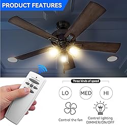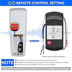 【Universal Ceiling Fan Remote】This universal ceiling fan remote control is specifically made for Hampton Bay,Hunter fans, but it almost works all regular 3-Speed AC ceiling fans like Honeywell, Westinghouse,Home Decorators Collection , Minka Aire and other brands 【Hampton Bay Ceiling Fan Remote Replacement】This ceiling fan remote control is a replacement for remotes FAN-HD, FAN-HD5, HD5, L3H2010FANHD, and L3H2014FANHD,RR7079T CHQ8BT7078T CHQ7078T UC7078T. Works with receivers RC-18R, FAN-18R, RC-28R. FAN-28R. 【Easy to Install】It was easy to program to ceiling fan. Just set the 4 on/off switches the same as your existing remote, install a 9V battery and it's done. Remote control's 4 DIP switches are in the battery compartment (they are hidden behind the slot for the battery itself).It works and all circuit components are located on the back of the circuit board,you just can't see it until you take it apart. 【 Purchase a Ceiling Fan Remote Control Kit】Check your original ceiling fan remote controls and match our picture. Note: This replacement ceiling fan transmitter does not have a Reverse button.If the FCC ID number on the back of the original remote is anothers,please purchase a ceiling fan remote control kit from our store. 【 Hampton Bay Fan Remote Control 】 This item does not include a Receiver and 9V battery, it's ONLY a FAN-HD(HD5) remote. This fan remote has 5 buttons, 3-Speed (High/Medium/Low) and OFF for fan speed control, Light Dimmer for Dimming. Please note that this remote does not have the button of Reverse. Light dimmer button just controls the brightness of the incandescent lights, if your light is LED/CFL bulbs, just can control bulbs ON/OFF. 【Package Contents】 Includes 1 ceiling fan remote control with 5 buttons, 1 mounting bracket, 2 wall anchors and 2 screws. Does not include required 9v battery.